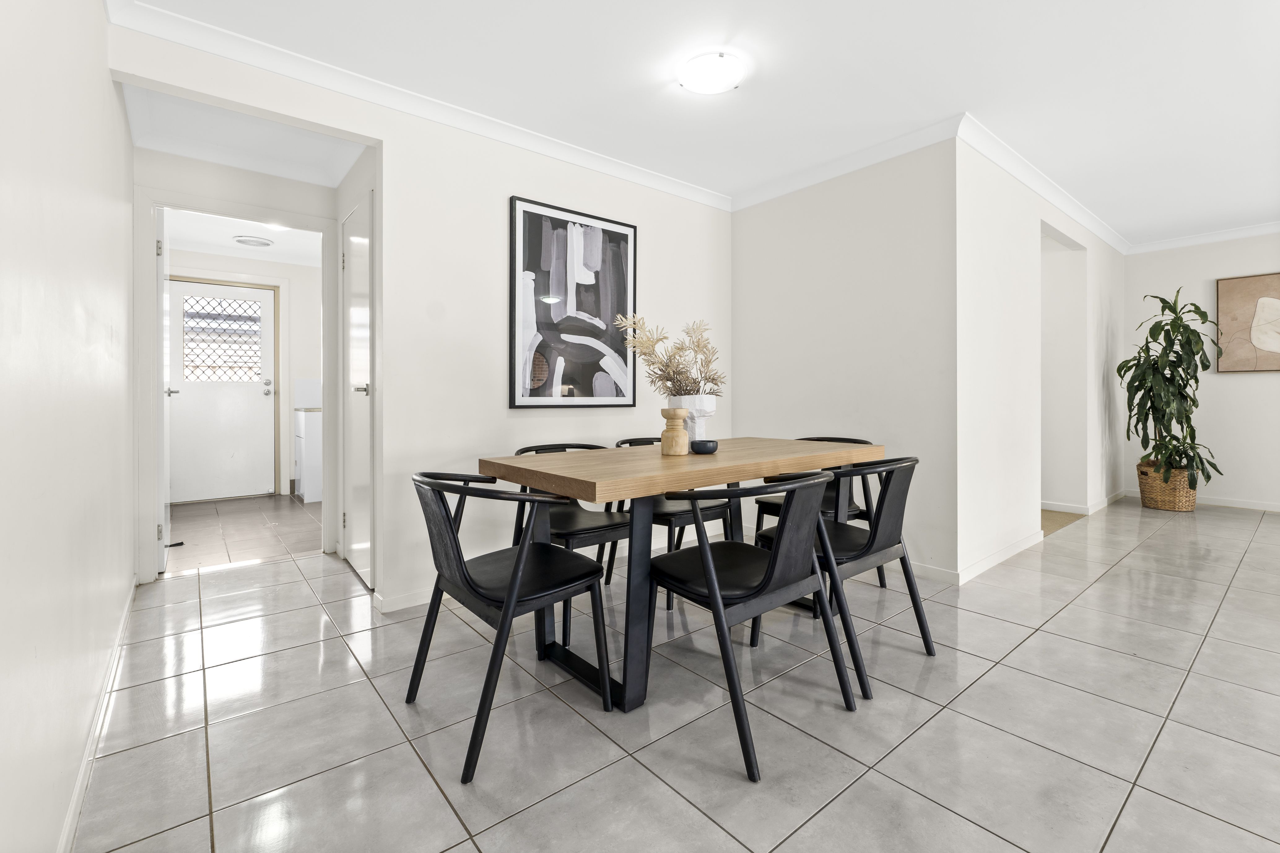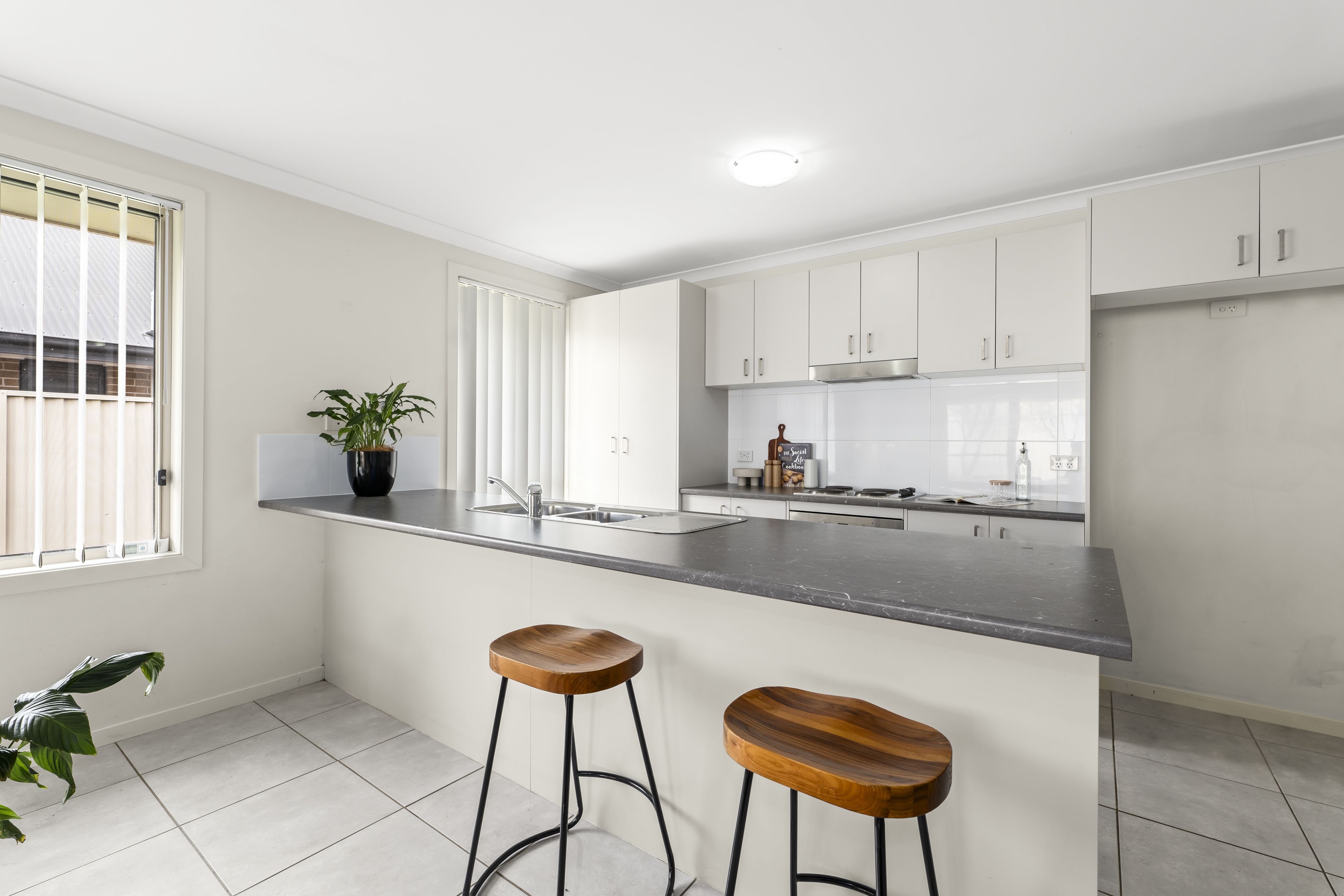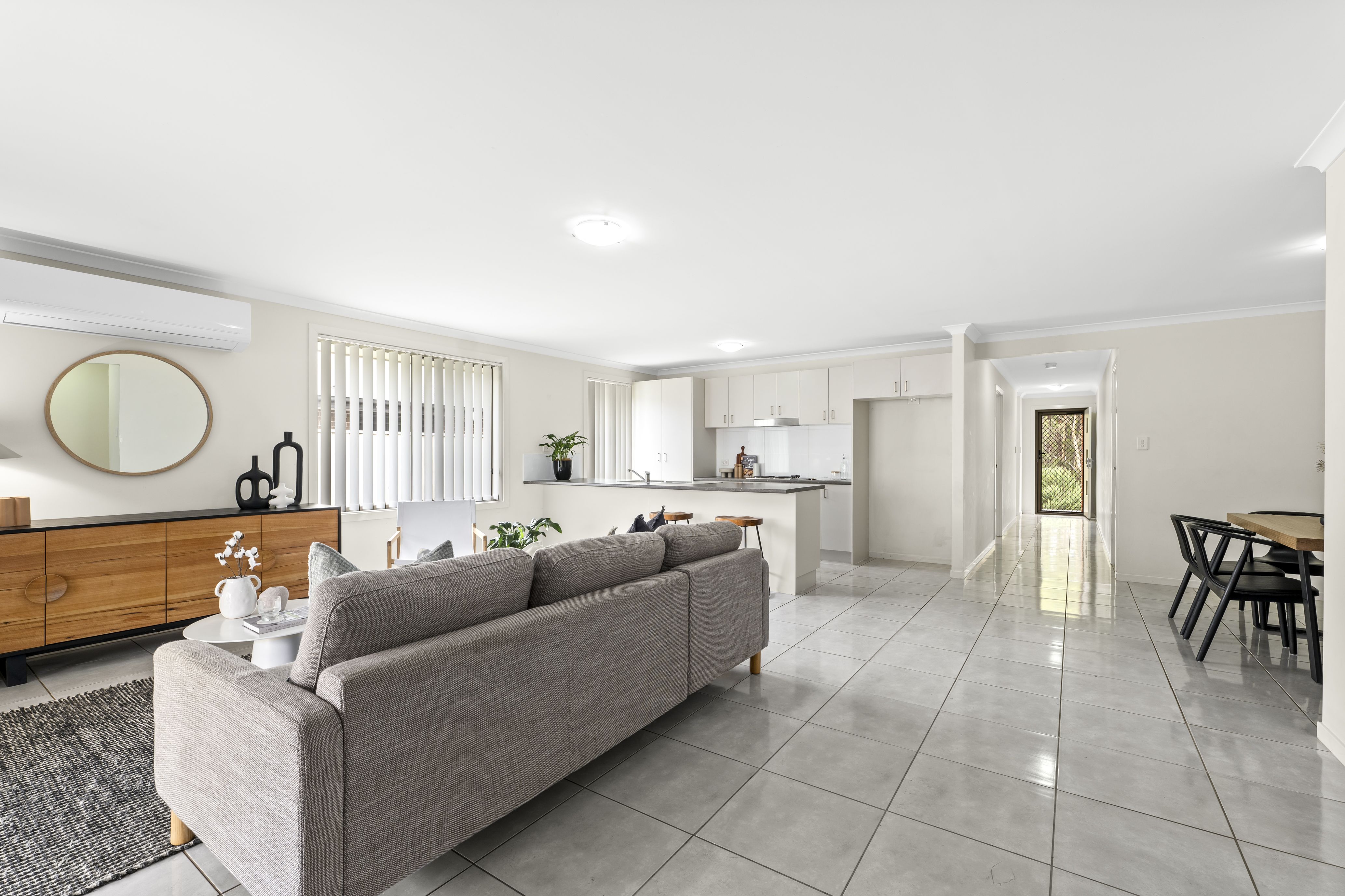 Inside, the home is filled with natural light, enhanced by bright tiled flooring and a well-designed layout. The open-plan kitchen, dining, and living area creates the heart of the home, complete with a modern kitchen featuring an island bench and stainless steel appliances. A second living space provides flexibility for larger families.