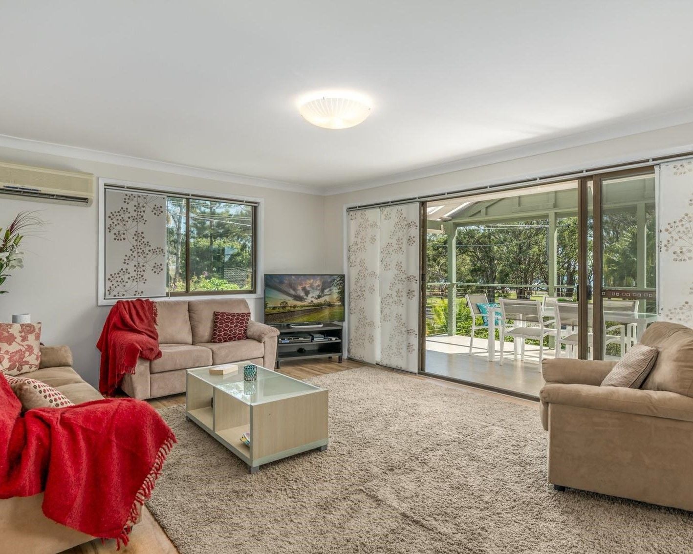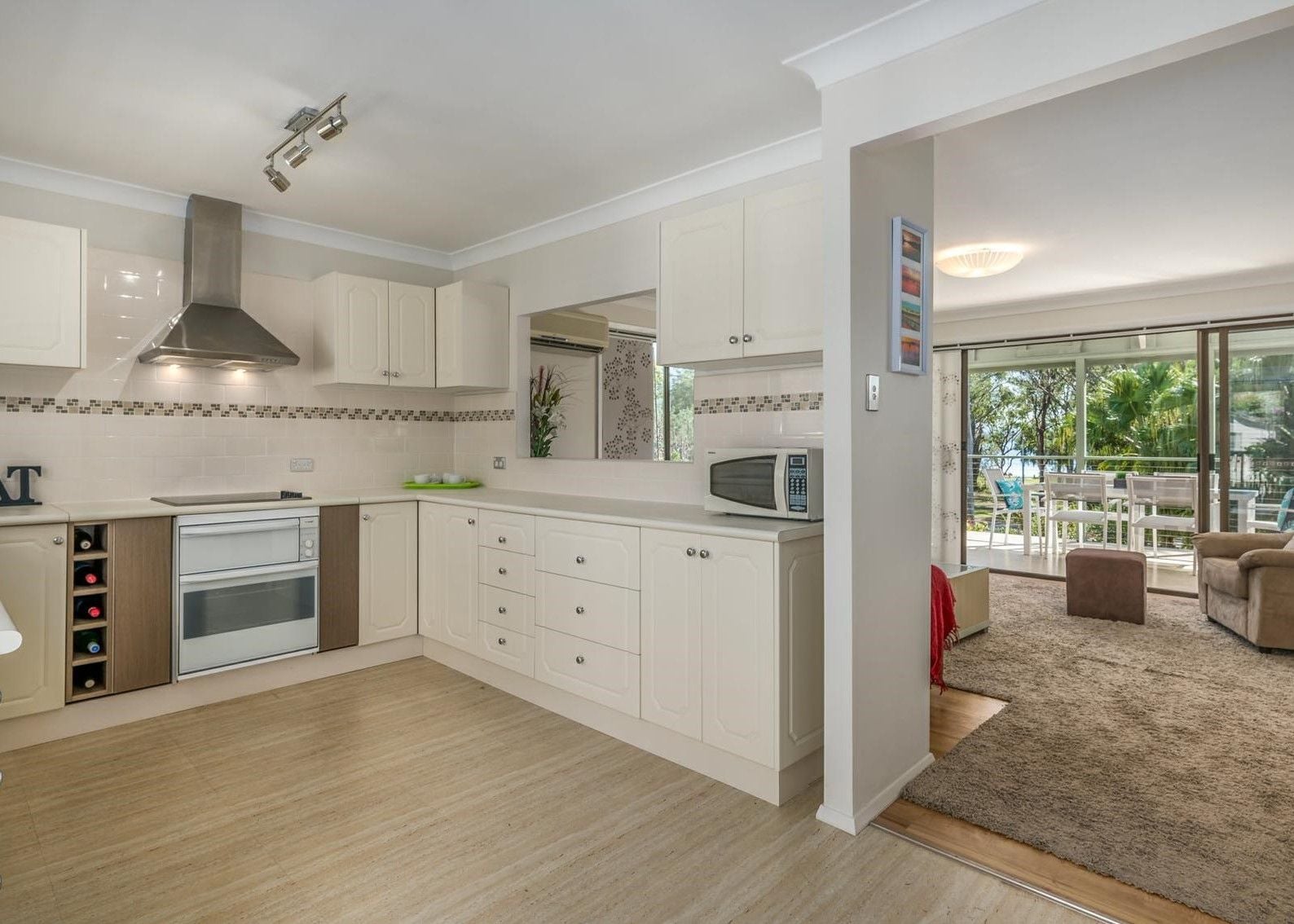 • Lounge room with large sliding doors opening to a spacious deck with water views